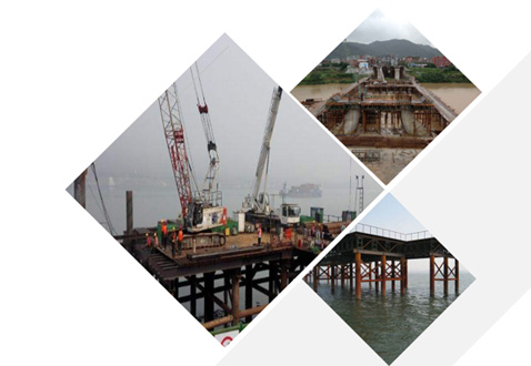 • 常見的施工平臺主要形式有:單棧橋平臺、雙棧橋平臺、利用鋼護(hù)筒導(dǎo)向和承載的平臺、利用圍堰或筑島承載的平臺、移動式平臺、水中整體吊裝平臺